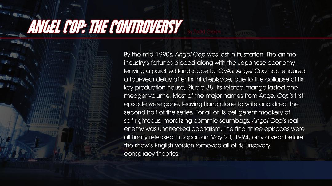 不过更有意思的还是这部OVA在美国引进了,但是!尽管画面相同,美版的英语配音,English dub,直接把批判美国的部分全部改没了,对比一下非常的酸爽。导致一开始看的是英配的我,很奇怪为什么字幕和配音对不上。