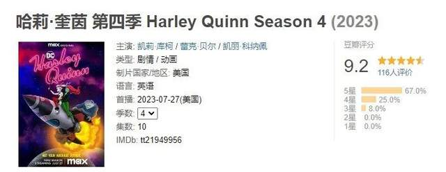 目前《哈莉·奎茵》第四季仅仅首播了前三集,口碑和评分依然在线,豆瓣9.2分,MTC拿到81分,不仅很甜,还很可爱,关键时刻还超帅。