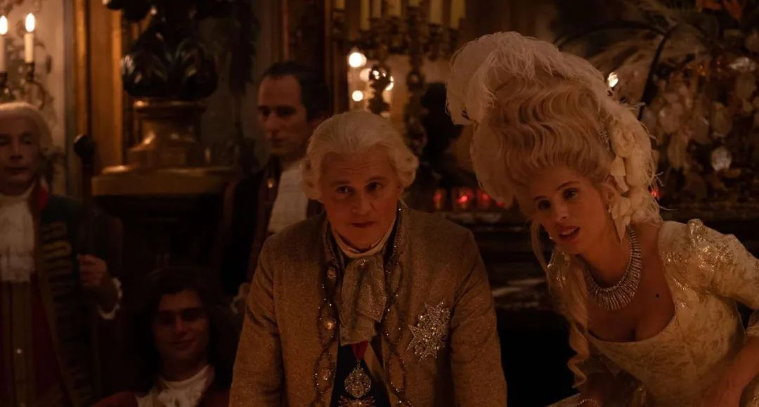 复出的约翰尼·德普其实也成了导演的参照物。路易十五的台词极少,多数时候只是静坐、凝视,或露出意味深长的微笑,他在这里不再意气风发,而是一个对繁文缛节早已厌倦的疲惫君主。