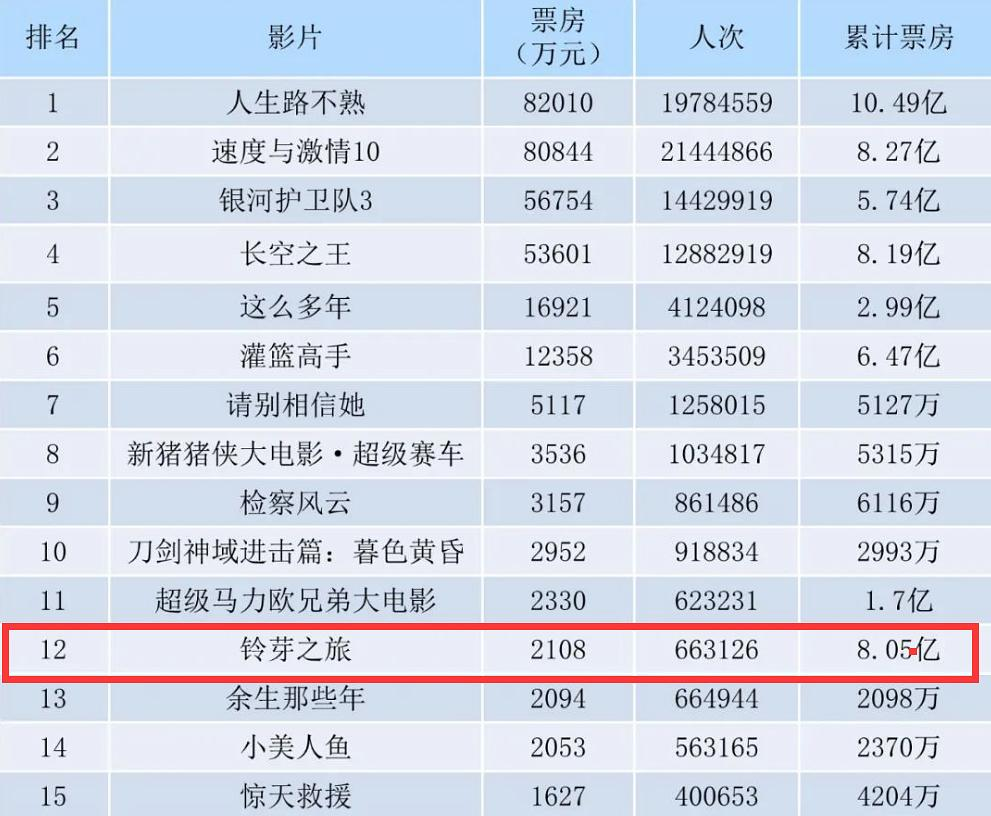 最近作为贴贴失败的案例,《莉可丽丝》加了绿毛后直接被KO了!虽然最后还是真百,但确实很掉价!!!就拿最近的《铃芽之旅》来说也是如此。我们都知道《铃芽之旅》在大陆的票房有8亿(下图来源:中国电影数据信息网),随后立马爆出了一个天大的新闻:原本《铃芽之旅》是有两个女主角的……