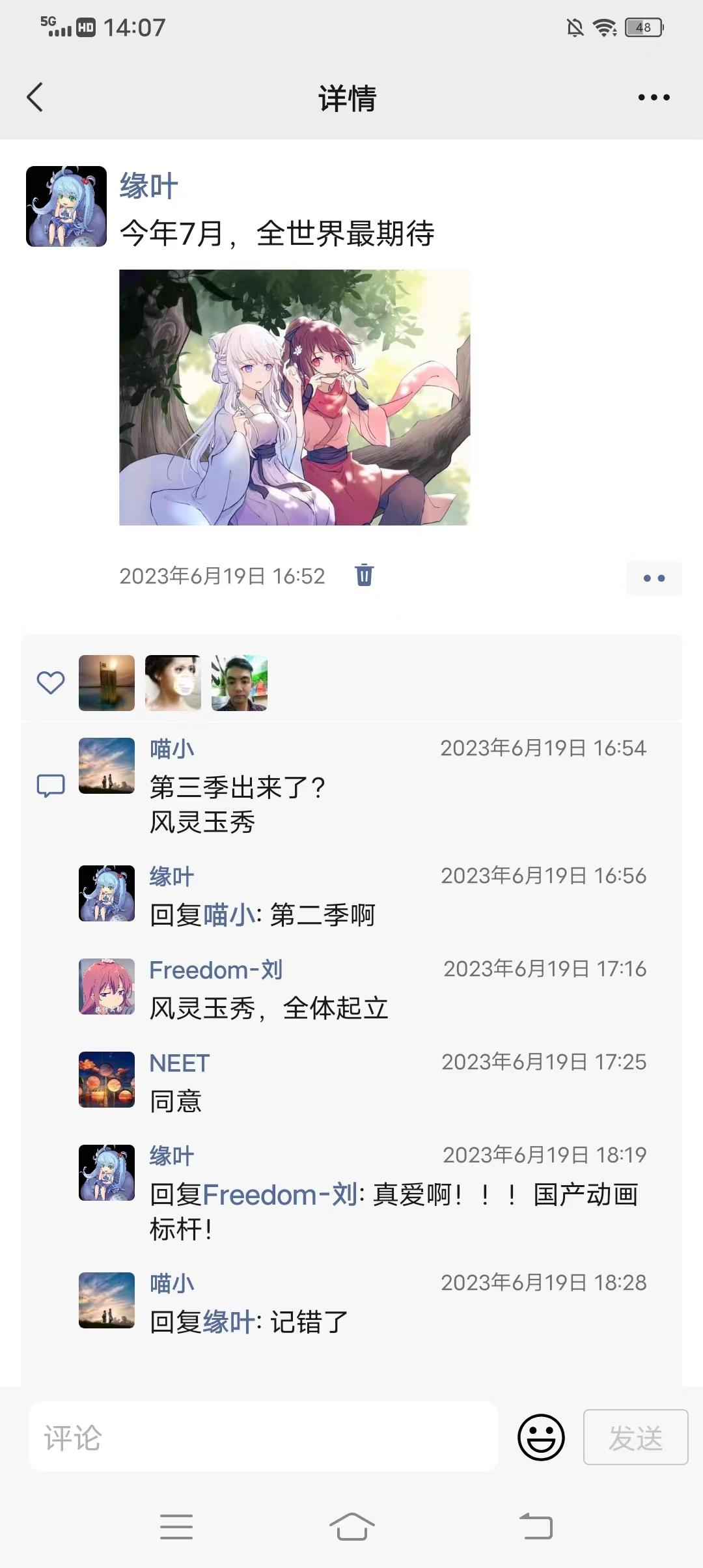 贴贴失败不可耻!《铃芽之旅》以失败告终,这很无奈。但只要有贴贴那缘叶自然是要吹一波的,尤其是近几十年国内动漫环境差的情况下,能出一部贴贴番,那必然是要吹的啊!!!《风灵玉秀》这样的贴贴番,是非常可惜的!就拿缘叶来说,直接在朋友圈发布的《风灵玉秀2》7月世界第一期待一样,这部新番还是值得肯定!