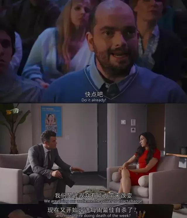 这样的节目从最初就是有问题的,只是大家都不自知,甚至连看影片的我们在一开始都觉得这样的电视题材很新颖,甚至乎被男主那套改变世界的观点说服了,他说他要做真实有意义的事,他想让他们的死有意义,但到底什么样的事情是用生命换才是有意义的?我承认,每个人对待自己生命的方式不同,也许有人觉得她用自杀来获得了她所需要的意义,这本没有对错,但绝对不应该放到电视屏幕上,用主流媒体来向社会传播这部分极端的“意义”。