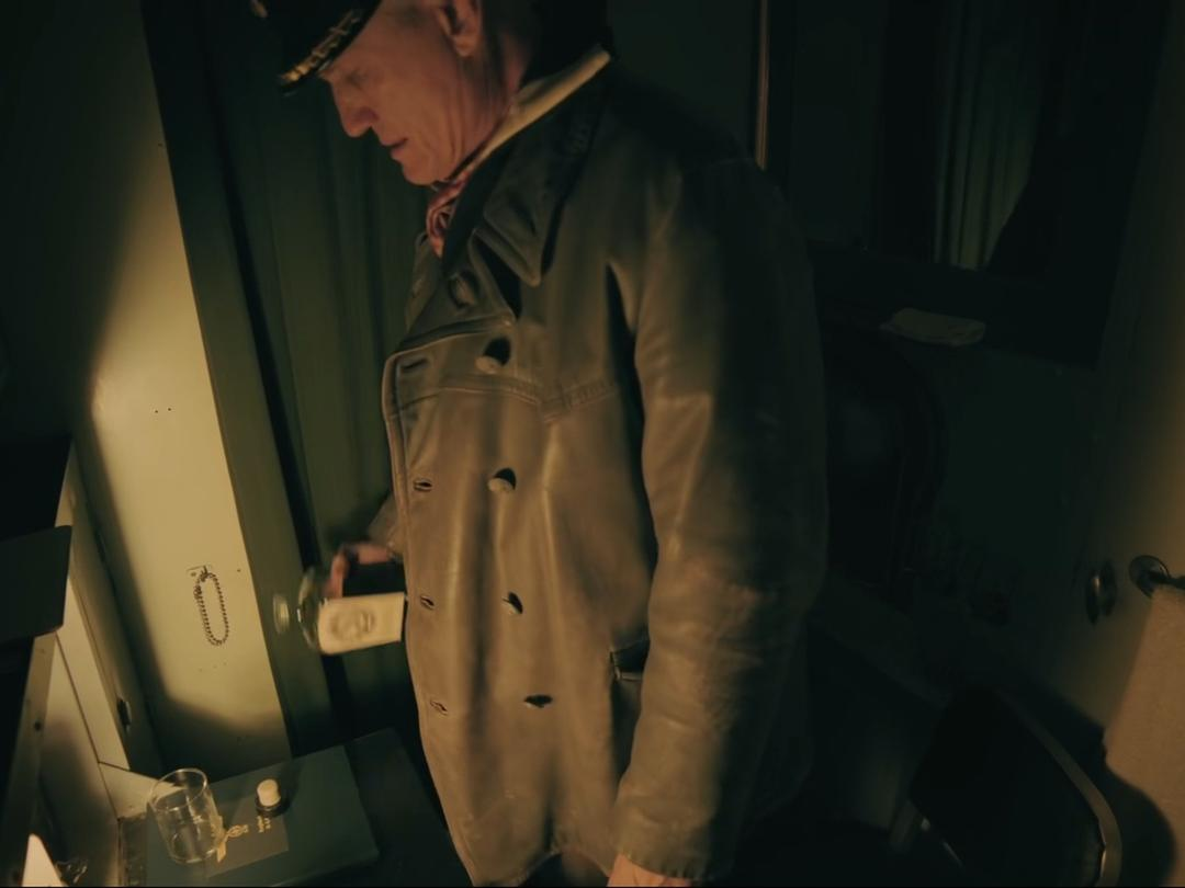 潜艇内部,凯斯勒成功的说服莱因哈特中尉缴械放弃抵抗,制止了一次内乱。化解了内外两个危机的凯斯勒身心疲惫的回到自己的休息舱只想接着喝上一口,继续麻醉自己。但是马上就要接近美国海岸线了,他必须保持清醒,于是强忍着倒掉了杯中酒。理想破灭,失去了信仰,还不能借酒消愁,那就只能找个没人的地方一个人偷偷痛哭流涕一场了。