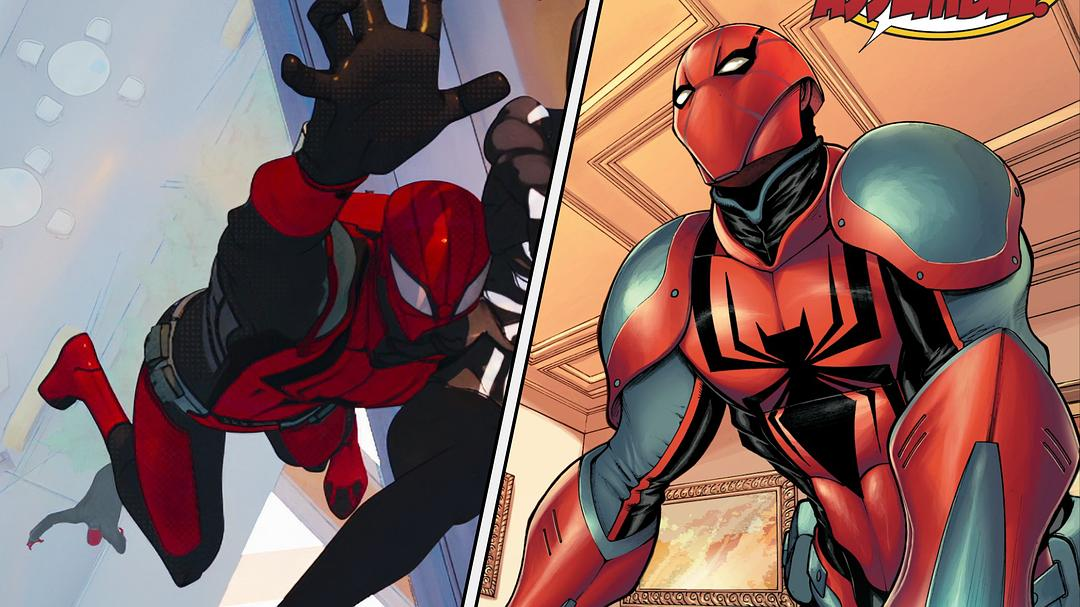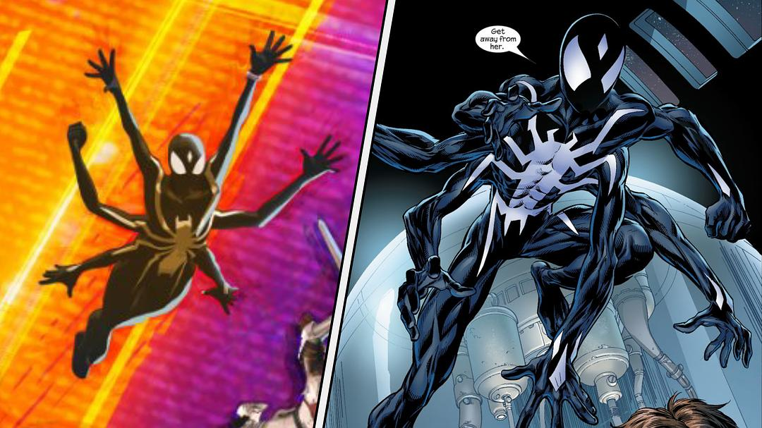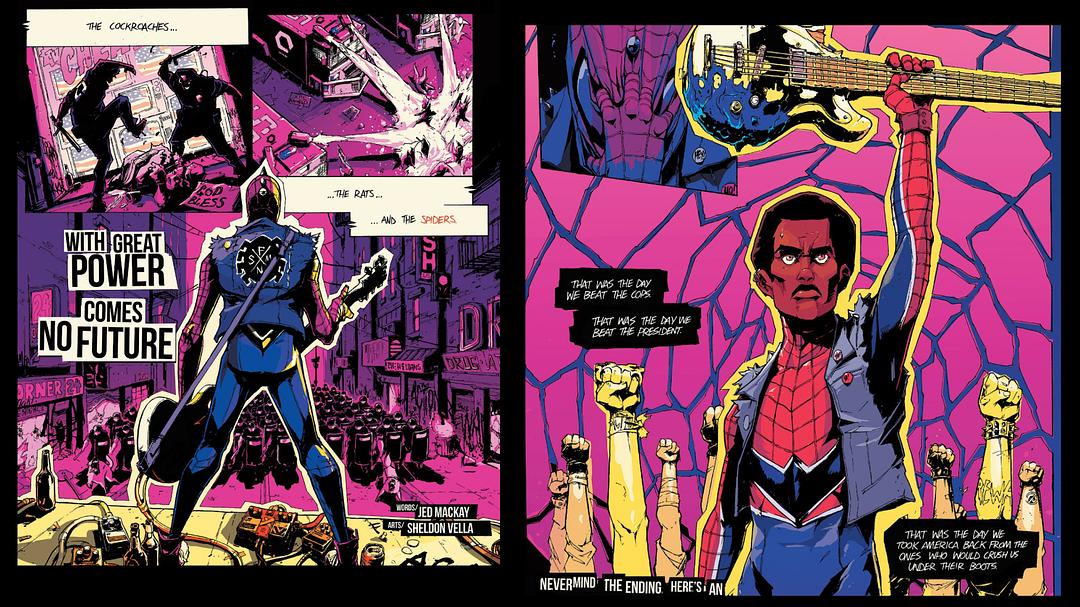 这个相当酷炫的蜘蛛侠,官方没有给予相关介绍,但这个形象看起来像游戏《蜘蛛侠:破碎维度》概念画中的形象。