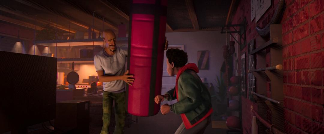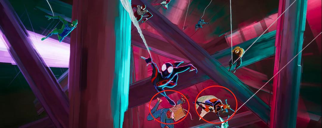ATSV开场采用POV叙事,本可以呈现两个主要角色在第一部中没有得到充足呈现的丰富面相,但影片中Gwen和Miles各自POV下的故事都只是上一部的补充和延伸,没有利用POV叙事限制、集中观众视角的特点让角色更丰富、微妙的维度得到呈现。Miles的部分尤为可惜,除了思念Gwen这一点外几乎和上一部没区别。而且既然台词都提到他未来上大学想研究“多元宇宙”,为什么不趁机呈现这个角色对“多元宇宙”在本体论和伦理学层面之可能性的思考呢(在ATSV中他研究多元宇宙几乎完全是思恋Gwen的产物)?两个角色POV相互融合的时候(即上一部彩蛋,Gwen来找Miles的时刻)也没有一种打开新视域的新鲜感。故事的后半部分基本上是最简单直接的线性叙事,只在最后一幕用平行剪辑玩了一个小反转(表明Miles回错宇宙,其实色调提示非常明显,偏绿,和主角Miles的宇宙不同)。这也是为什么有些观众会觉得影片中段的叙事节奏有些小问题,部分文戏过长、拖节奏。这倒不是文戏本身的错,因为几乎每一场文戏都和剧情推进或角色塑造相关,并不是废戏。但这些文戏过于功能化(推进剧情,或呈现角色变化),和打斗的部分没有构成有机的互文。与此同时这些文戏内部缺乏情感或故事层面的紧张感。比如追捕The Spot失败后戴着面具的Miles和父亲合作后展开的那段对话,有太多太多美式青少年影视剧的套路。观众能预料到对话和情节的走向,自然会觉得拖沓。而Gwen和Miles的部分完全也可以打斗部分的动作设计而非主要通过情节和对话来反映二人关系(情感和理性层面)的发展与变化。