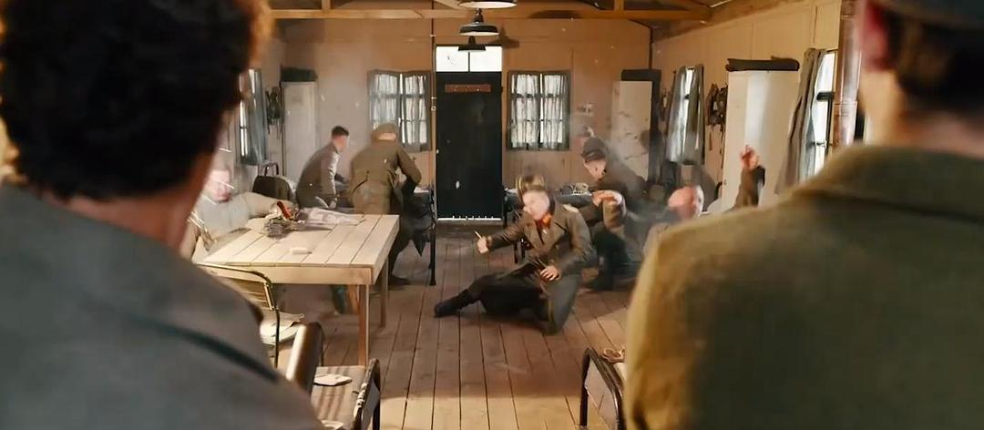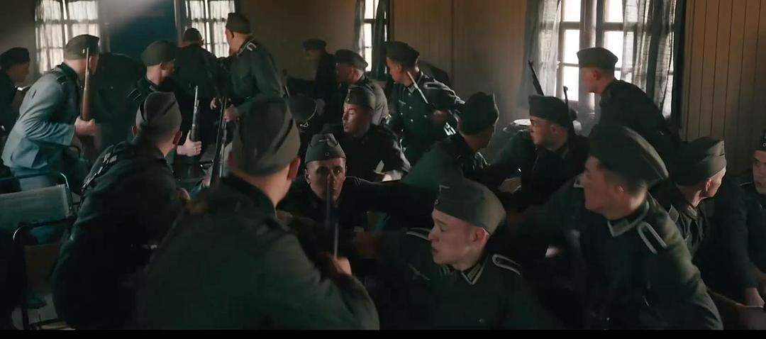 剧情就是这4个德军在餐车上喝酒,其中背对着镜头的地中海有个装绝密文件的箱子,女主角和小黑等他把箱子放在旁边过道就开始行动。