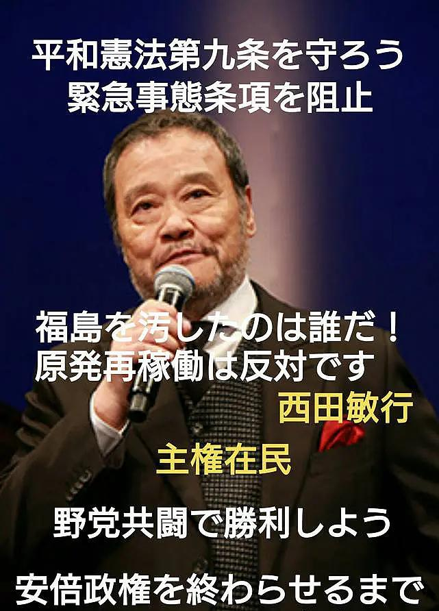 (注:除西田敏行外,活动的发起人/倡导者当中还有电影导演山田洋次、主持人黑柳彻子以及已故作家森村诚一等数位进步文化人士。)