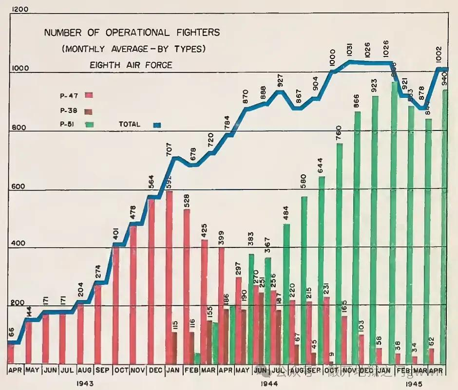 1943年4月到1945年4月期间8AF战斗机部队每个月的各型战斗机的平均可动数量,蓝色这条线代表每月的所有战斗机的可动数量的总和。