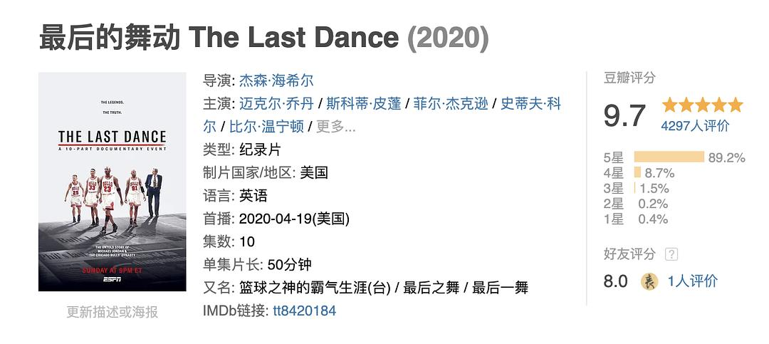 为了记录他生涯的成就,最近Espn播出了他的最新纪录片《The Last Dance》(不是伍佰唱的那首歌),创下了Espn的收视纪录,在豆瓣开局9.9分,几个小时后跌到了9.8分,如今长期稳定在9.7分。