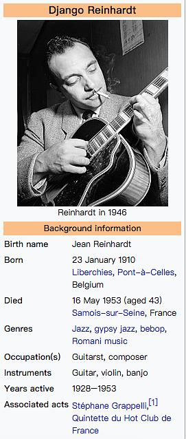 Django Reinhardt是比利时出生的法国爵士吉他手和作曲家,被认为是二十世纪最伟大的音乐家之一,欧洲爵士乐史上最卓越的先锋人物之一,也是吉普赛爵士(摇摆爵士)的创始人。