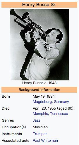 Henry Busse在德国出生,从小学小提琴,结果也是命中注定,有一次手指断了,医生没给他接好……从此以后不能拉小提琴,就改吹小号了。这哥们的一生也挺传奇,18岁偷渡到美国纽约,一句英文不会说,结果还就组建了乐团,不但在黑帮老大Al Capone(疤面煞星)的酒馆里演出多年,后来居然混到好莱坞,比大明星Bing Crosby周薪多一倍,最后居然在米高梅跟乱世佳人男主Clark Gable一起演电影你说牛逼不牛逼!