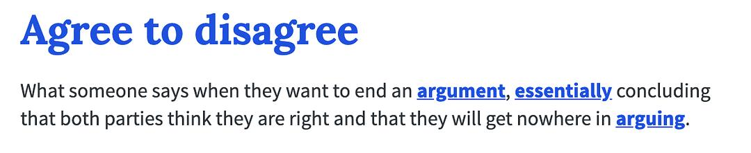 当谈话双方都认为自己是对的,再争下去没有意义时,他们就会说agree to disagree来结束争论。也就是双方保留意见,“求同存异”的意思啦。
