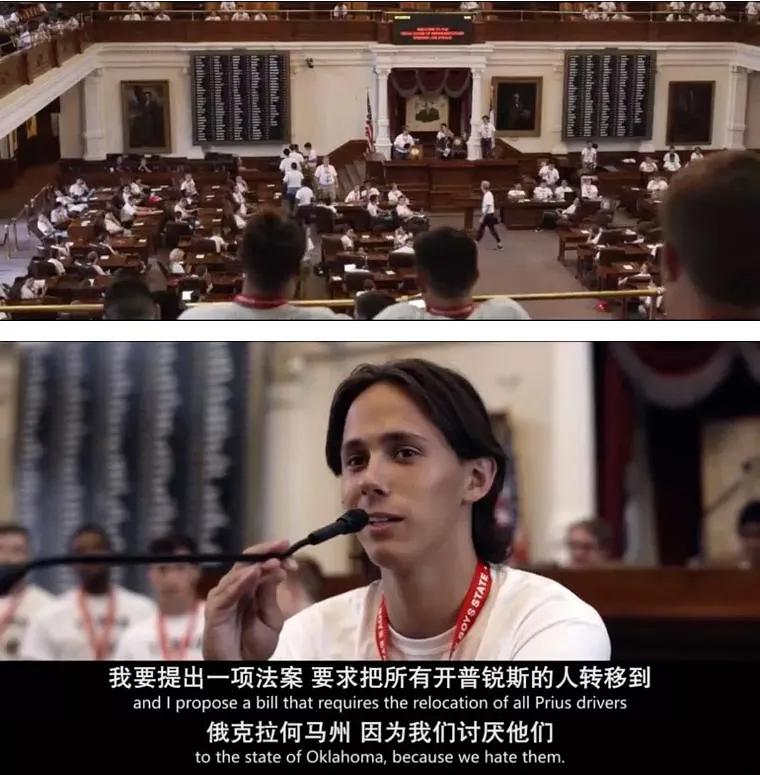 这是一部非常有意思的电影。1200名17岁的男孩参加政党模拟活动。分成600人一组的民族党和联邦党。男孩们自己要制作党的纲领,选举政党主席,并争取选举上1200人的州长。民族党和联邦党各选拔一名男孩作为州长候选人,然后二人相互演讲自己的政党政策,争取更多的人把选票投给自己,这非常像现在的特朗普和拜登。
