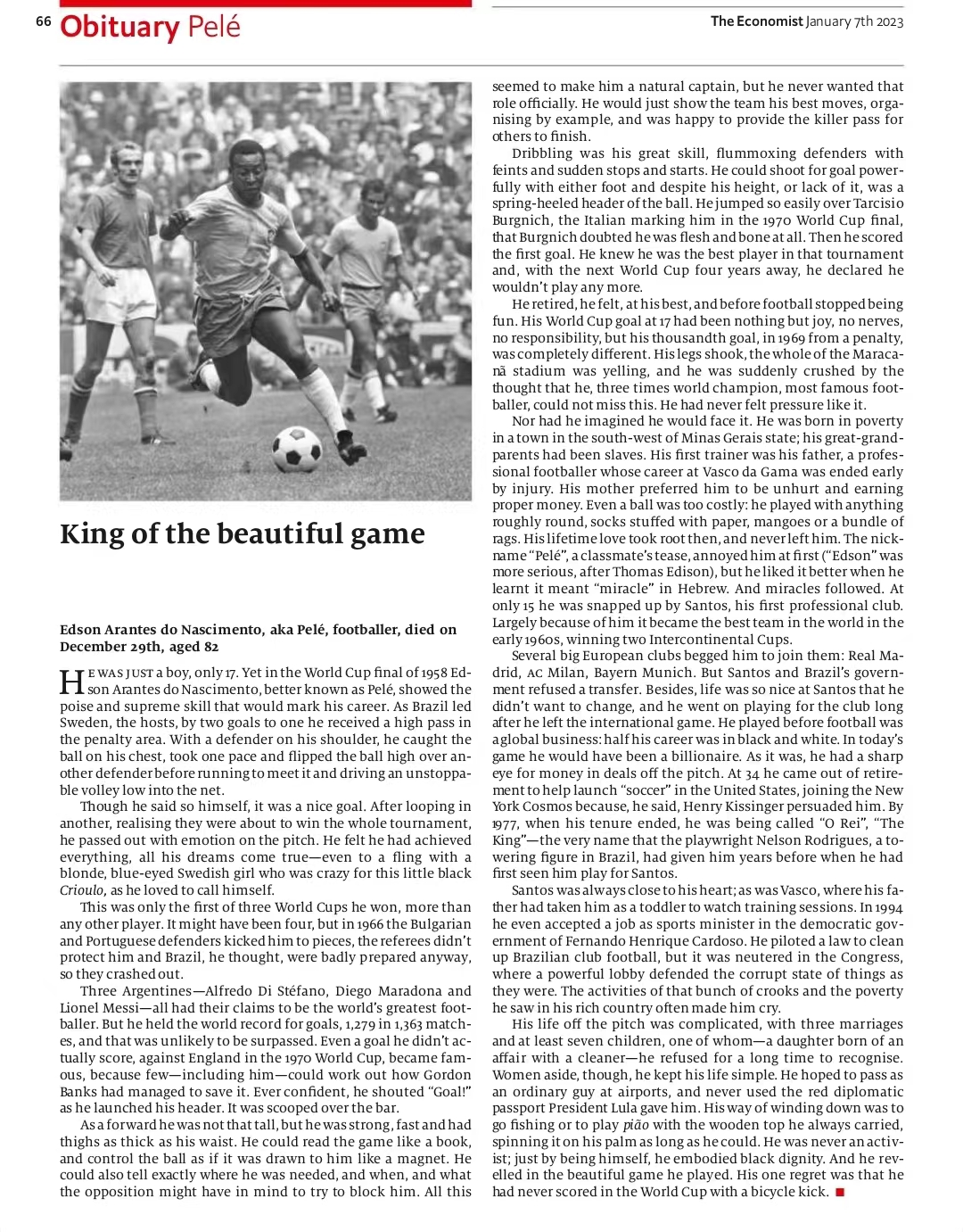 三位阿根廷球员——斯特法诺、马拉多纳和梅西——都曾声称自己是世界上最伟大的足球运动员。不过贝利在1363场比赛中进球1279次,这个世界纪录不太可能被超越。1970年世界杯对阵英格兰时,就连他没有破门的一粒头球都出了名。因为包括他在内,大家都搞不清楚门将戈登·班克斯那场“世纪扑救”是怎么做到的。当时贝利非常自信,甩头攻门后大喊“球进了!”,然而这粒球被门将托出了横梁。