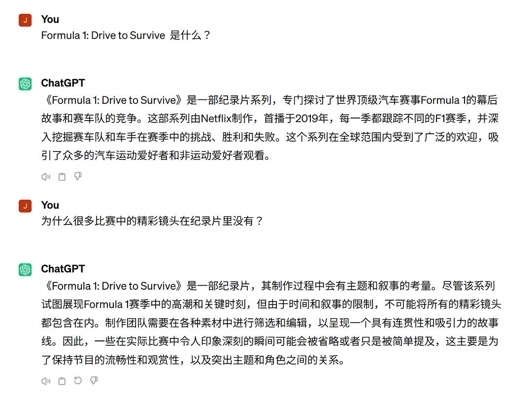 《Formula 1: Drive to Survive》(以下简称《FDTS》) 这部 F1 的伴随纪录片已经拍到第六季了,肯定有很多人和我一样,在看的过程中总不由得发出灵魂拷问 —— “为什么赛季中的很多精彩镜头在片中完全不出现”? 所幸这年头遇事不绝可以问 ChatGPT: