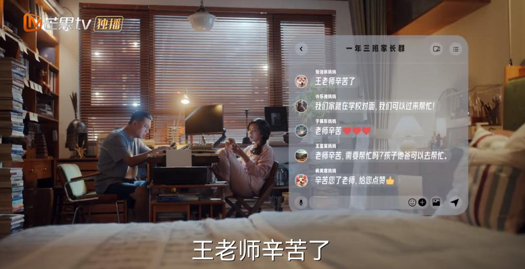 诸如此类的情节,剧集里还有很多。比如小女儿果宝一年级开学第一天,刘向上正在家里构思新作,突然家长群里炸开了锅。
