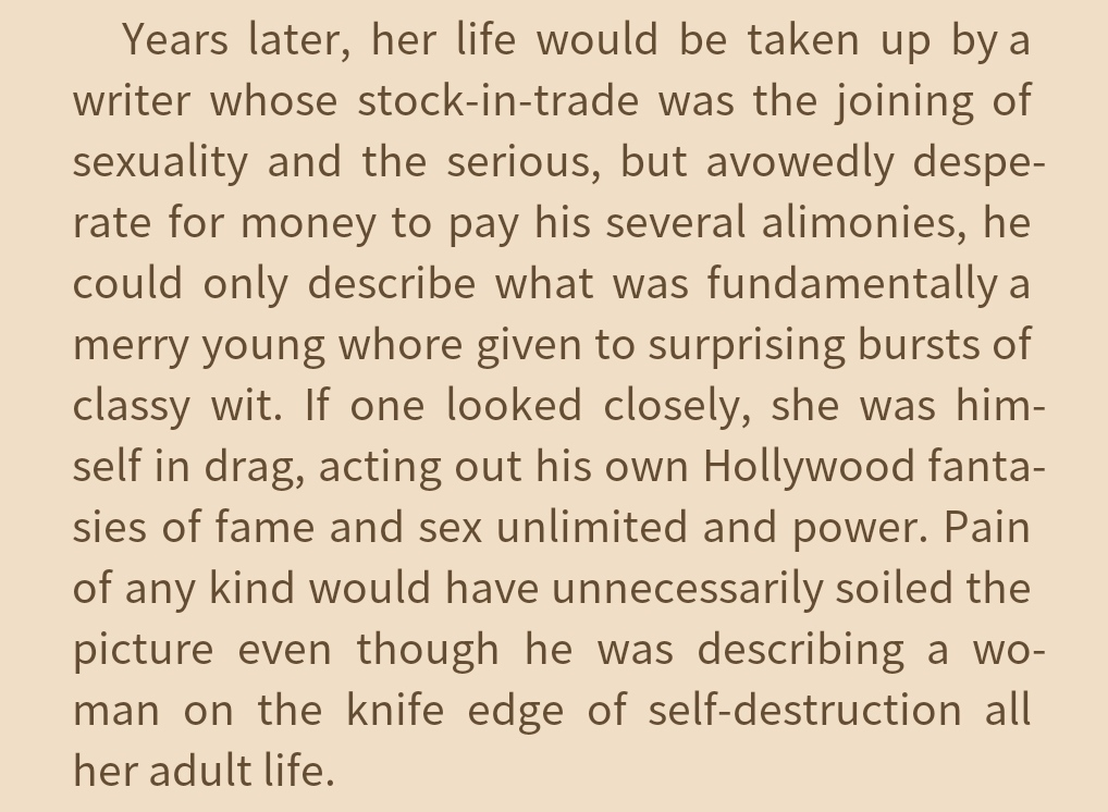 nFun Fact:玛丽莲、JFK和RFK尚还在世时毫不夸张地说他们之间没有一条绯闻——至少是现在能查证到以及在传记里读到的绯闻,而1973年,诺曼·梅勒为了两万五千美元(他自己说的)而在没有见过玛丽莲本人,仅仅看过几本传记的情况下写了《Marilyn: A Biography》这本“传记”,说实话把它当作小说就像乔伊斯卡罗尔欧茨那本《Blonde》(金发美人!网飞煞费苦心宣传的传记片由一本小说改编而成。有中译,如果不在乎稀烂的翻译的话可以去搜索《浮生如梦》,写得很好)一样那么我不得不承认梅勒写得真不错,但既然这是一本传记,那我只能搬出米勒在其自传中对他毫不留情的评价: