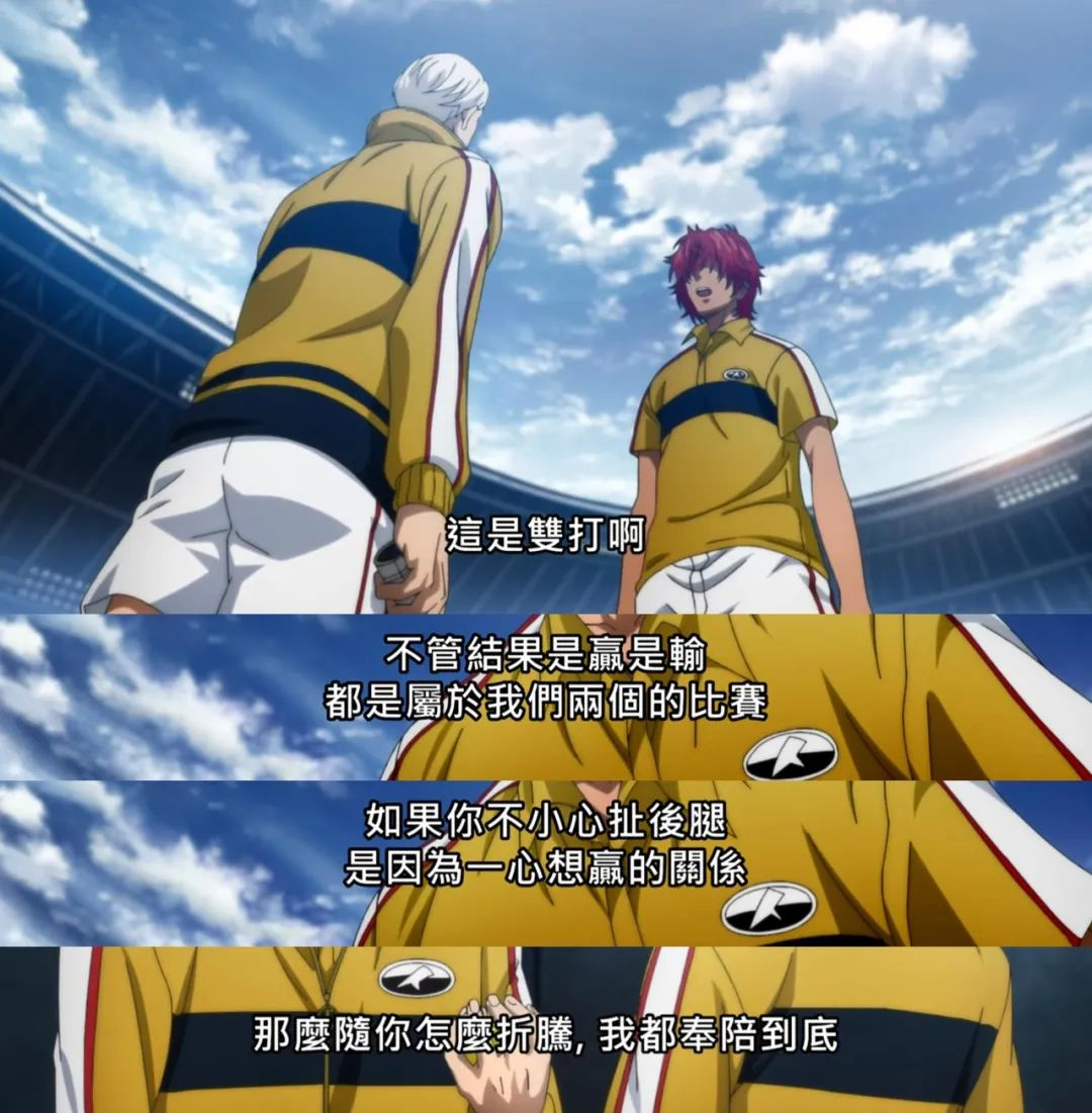 nBGM我好喜欢啊啊啊啊啊啊啊啊!这种古风魔幻好香,真是太契合玄幻网球了呢!nn有两句台词真的有被感动到。n你有一点我无论如何也比不上,就是你从无法打网球的低谷里爬了上来。n来年的立海,不再是王者,而是挑战者。nn丸井x玉川VS向日x忍足n玉川这个老鼠屎真是看得我心头火起。立海和青学一战以后应该反思了吧,所以并没有苛责制裁啥的。但不能纵容这种废物啊,软骨头跪久了站都站不起来,海堂当年练习回旋蛇镖的毅力和勇气一点都没看见。宠个p啊,跟海带比他配吗?未来部长不用技术高至少人品得过得去吧?许斐希望海带专心钻研技术,而不是把(本来就没多少的)心思放在处理网球部的日常事务上。这可以,逻辑上不成问题,但我希望的是看到在全国大赛败北之后,立海意识到了自身教育的失败,从而让三巨头更多给他网球以外的帮助,从而让海带的人格得到成长。实在不行退而求其次,王者为尊的立海也应该安排一个像样的部长,请问你们放心把优秀的网球部交给一个这样的人吗?nn真田x柳VS凤x桦地n制作组不会搞可以不搞。桦地可以一眼复制零式削球手冢领域,三局复制不出风林火山。柳能秒接乾的瀑布发球(可能是因为数据更多),却和真田都接不到凤的一球入魂,幸村还说一球入魂难。我很喜欢冰帝也很喜欢立海,但不能这么离谱。nn柳生VS宍户n凤宍总能用爱情创造奇迹,虽然看起来好像没有那么厉害但我不在乎,谁让仁王不在呢!柳生输在对象不在,真是亏大了。srds我好想看凤宍和82双打,一边有技术,一边有(可能是全剧最深的)爱情,会是谁赢呢谁赢呢?nn幸村VS迹部n赛前灭五感可还行……说好的之前要打着打着对对手全面压制从而形成yips呢?虽然主上是我大本命但制作组也不能这么画大爷吧?每次两人对峙的分镜大爷都不忍直视,气死我了!!