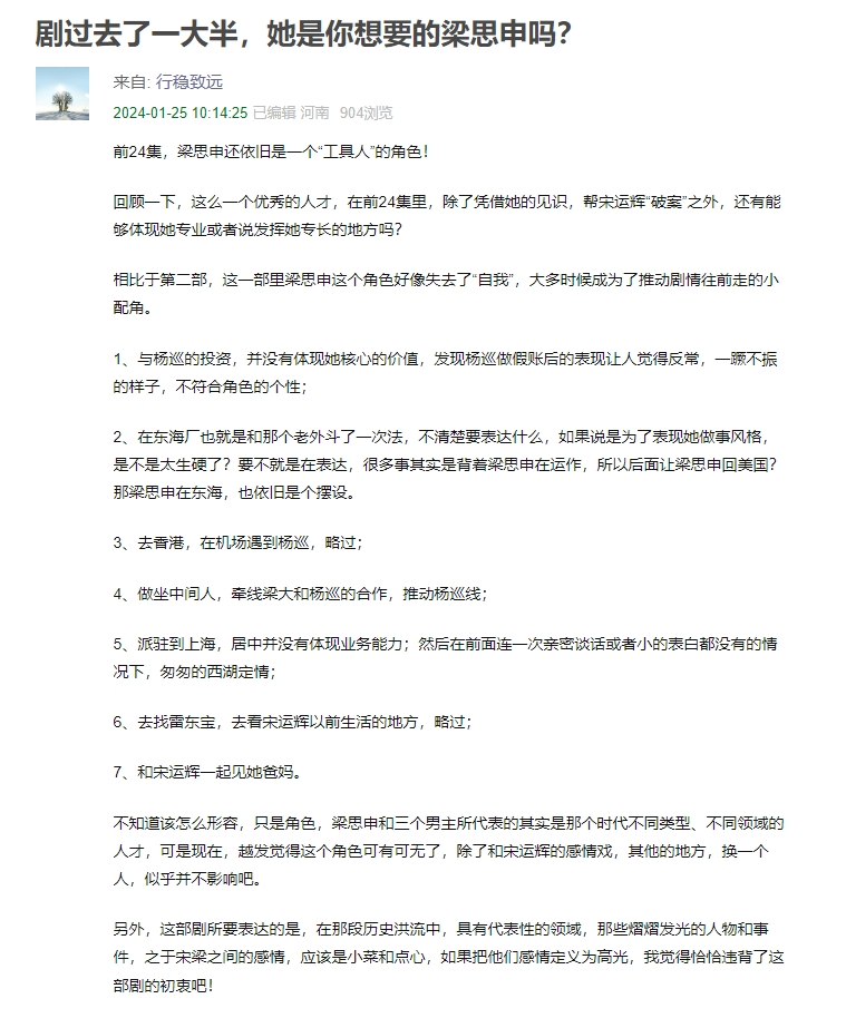 梁思申是个工具人,截止到24集,依旧没有做一件能够符合第四主角和优秀留洋青年特征的事儿!倒是这几集的恋爱和见家长,浓墨重彩!