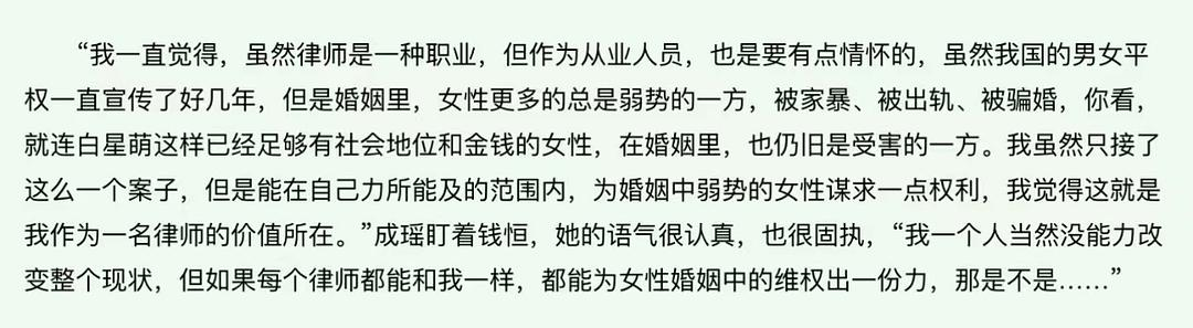 如果说前期同意借浴室是出于怜悯和体恤下属,后来的事,就变得越来越不纯粹了。不受宠三人群里其实早有明眼人嗅出端倪:钱律很照顾她。从很早的开始,他对她就有着比对众多前助理更多的宽容。背错法条办错事,很多个理由可以让她走人,但,最后,都安然无恙,甚至到了她主动要辞职,他不批准的一反常态的地步。是他恋爱脑吗?起码一开始几次不是,或不全是。过尽千帆的钱律,看过一些家事里的污糟,也见识过一些婚姻里的彼此算计,比如白案,自打听说白等不及哪怕放弃更大的利益,也要告前夫,他瞬间就有了一些猜测,然后查出了真相。爱情和婚姻,他懂,人才,他也能识别,他看过她笨鸟先飞的努力,也知道她具有的潜力,在逆境里生存,身体力行地证明自身价值。