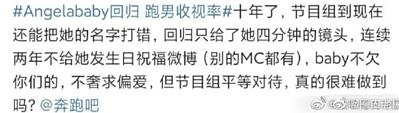 在综艺界,这种战火也逐渐燃烧起来。例如23年Angelababy杨颖回归综艺《奔跑吧》(俗称跑男)时,粉丝们发现好不容易回归的杨颖所占片长只有4分钟,另一位女明星白鹿却有10分钟。当时引发了不少的抗议浪潮。