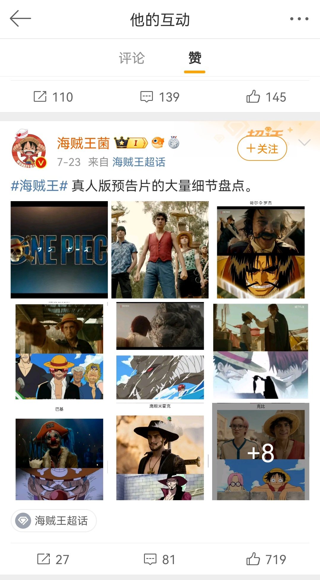 陈少熙经常点赞海贼王相关内容,包括海贼王真人版相关信息(点赞不做统计)