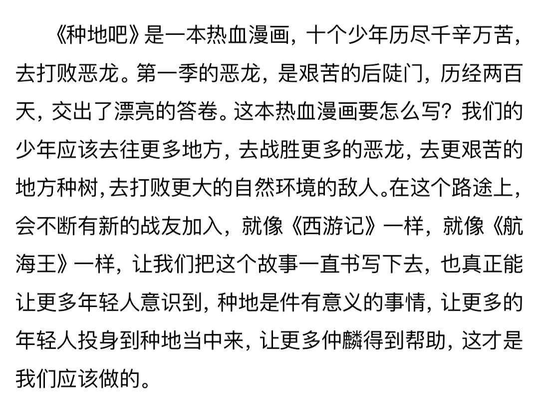 最后重回旧地的策划,简直了!不知道节目的策划到底是谁,真的很有创意,很有温度。最后一期少年回到最开始的地方,这个策划太好了。看完《种地吧》,才看的《你好种地少年》,最后一期真的太感动了,太温暖了。