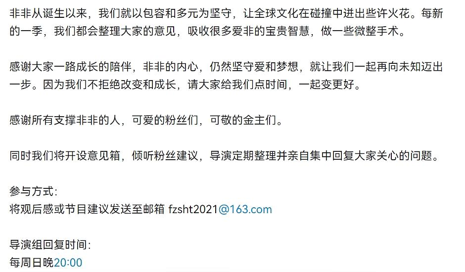 面对观众的种种建议,甚至言辞激烈的批评,节目组并没有逃避,也没有想要“教观众做人”,而是连夜撰写700字小作文回应,表示每一条节目评论弹幕都在看,并且对于提到的一切问题都不会回避。甚至还在评论区贴上了“意见邮箱”,邀请粉丝们建议,并与粉丝约定会在每周日晚20:00回应重。