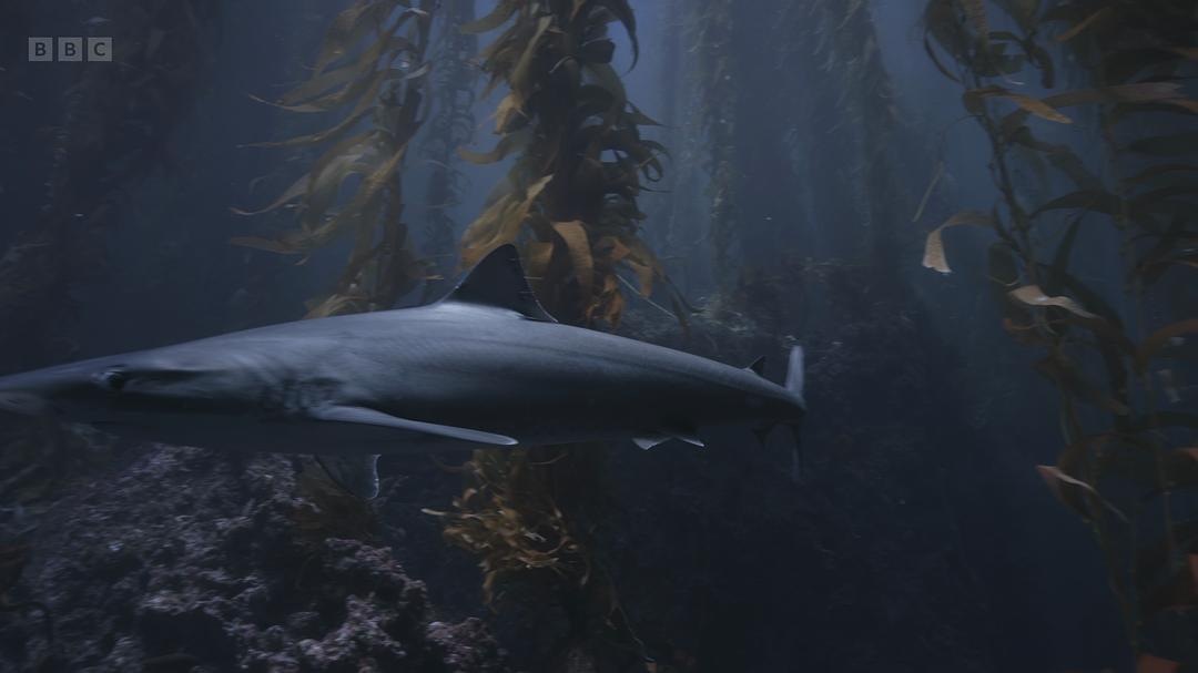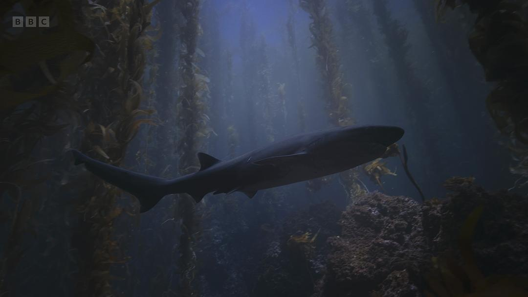 2. 巨藻与多种鲨鱼及狼鳗: 巨藻森林为角鲨提供庇护,但充满捕食者,角鲨靠尖刺防御。