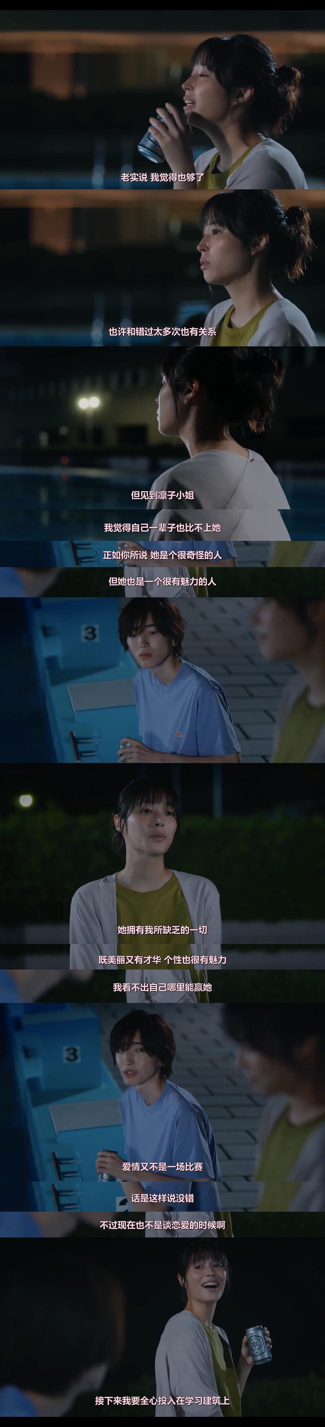 第一集充满了心动与好奇,女主重启人生的奋斗史,热血又真实,而从拓捡到女主手机那一刻开始,便充满了心动,“要不要一起玩石头剪刀布”“当然没有忘记你啦”等等等等,狠狠期待住!!!n第二集,奋斗的青春果然是最热血的,在意的心情说明某些情愫已经开始萌芽并注定暗流涌动。n第三集,开始更强烈地感受到专注于自己眼下最重要的事的重要性,两人心照不宣选择了彼此退步言和的关系很戳人。话说,两人之前的相处距离是真实存在的嘛,感觉又亲密又舒服,绝对不一般,一起在露台看海的样子和背影太好磕了,美哭!!!n第四集,看到一条很戳心的弹幕说“我们总在等待心中的最佳时间,一直犹犹豫豫说不出口,果然还是不够爱啊”,拓的表白没能说出口感觉也有这一层原因吧。而建筑师明媚开朗的前妻给女主带来的冲击也震动心扉,“前任”始终是一个会不自觉进行比较的存在,但女主你也很明媚可爱啊啊啊啊!!!最后的泳池互动,青春,悸动,唐突,拿捏得妥妥的!!!