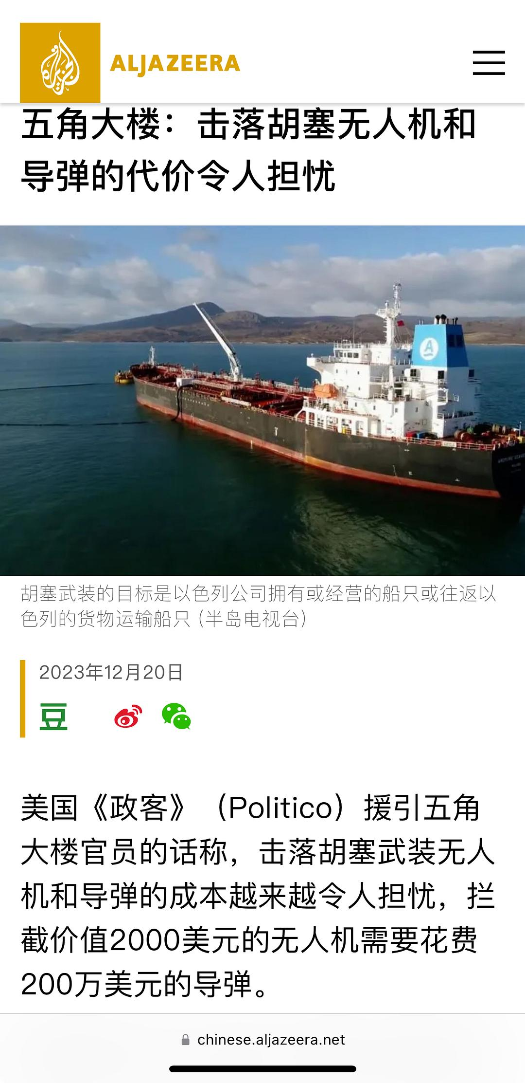 活跃在也门和沙特西南部的胡塞武装,在红海湾拦截袭击以色列商船。美国击落胡塞武装的十几架无人机。五角大楼表示,用200百万美元的导弹击落2000美元的无人机,成本太高,不划算。