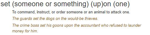 set (布置/指派)on/upon sb (对付某人)表示袭击,剧中的表达是被动态的形式,这个短语还常用于指示(某人或动物)去攻击他人。
