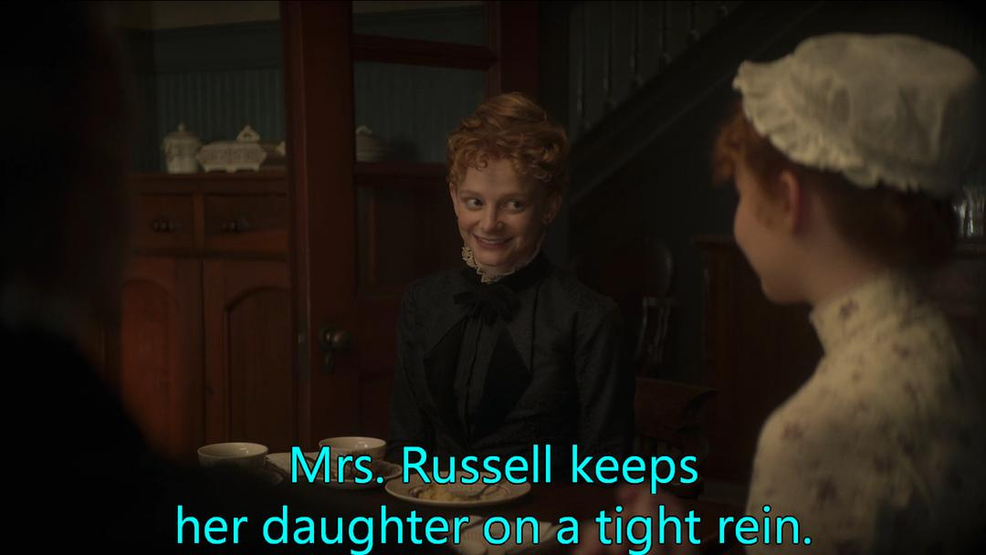 剧中的罗素夫人对女儿管的很严,不允许她独自外出,并且明确告诉她,她没有自己挑夫婿的自由,她的婚姻必须由母亲说了算。