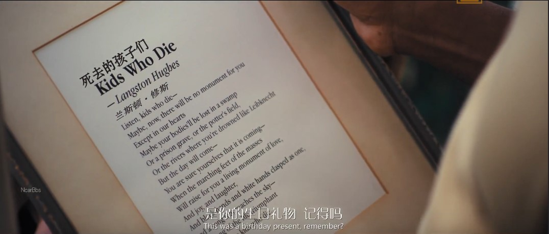 另外一处直接引用出现在Frankie和Marcus的爱情里。第二集两人在Cozy Corner调情,就直接用了被誉为“哈莱姆桂冠诗人”的兰斯顿·休斯的《死去的孩子(Kids Who Die)》。在30年代美国左翼文学奔腾涌流的时候,这位无产阶级诗人写出了非常多革命情绪饱满的诗歌