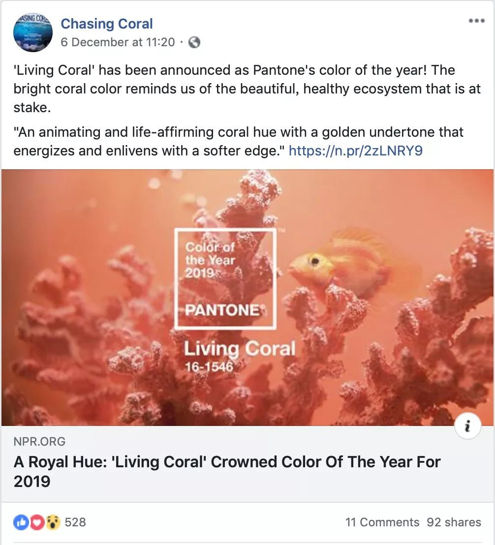 就在2018年12月PANTONE Color发布的当天,《追逐珊瑚》影片的脸书也转发了这个话题,不过只有11个评论,92个分享。