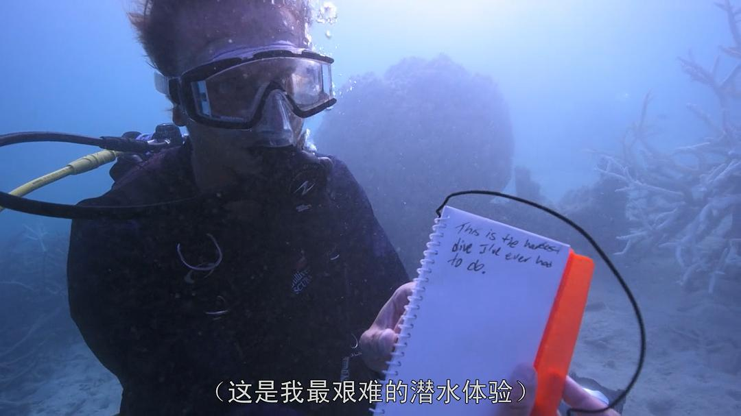 随着篇幅的展开,扎克的团队开始研究在海底架设延时摄影机,以期拍下珊瑚最大的生存危机——白化的过程。调子开始沉重起来,设备进水,镜头失焦导致两个月白拍,亲眼看着珊瑚群在身边死去,扎克手里捧着覆满海藻灰的珊瑚尸体,“这是我最艰难的潜水体验”——扎克在海底的笔记本无声抗议着。会议上,扎克展示着他们千辛万苦手持延迟摄影拍下的图片,上几张还是灵动绚烂的珊瑚礁,下几张就是一片死气沉沉的“坟墓”……所有人脸上的笑容随着珊瑚接二连三的白化逐渐隐去,震惊,焦灼,伤心刺痛混杂在心头,眼泪不停地掉,尽管隔着屏幕,也仿佛亲身见证了那一场又一场巨大的死亡……