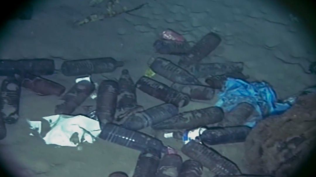 不仅有大量塑料垃圾、旧降落伞,甚至还有未爆炸的炸弹。n而很多的海洋生物,就生活在这些垃圾中间。n继续下潜至1600米,日光照射不到的深海中塑料垃圾更多。n它们是涡流和洋流带来的大量塑料瓶,恐怖的是,这些塑料可能会永远留在这里。