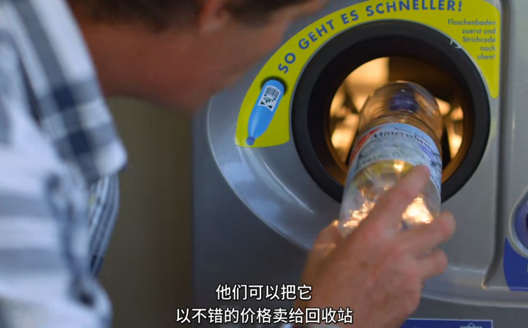 在德国慕尼黑,所有的大型超市里都有回收塑料瓶的机器。n你只需把塑料瓶放进机器里,它会扫取瓶身上的条形码辨别塑料种类,每放进一个瓶子就能得到25分钱。n零售商将得到的塑料,以不错的价格卖给回收站。