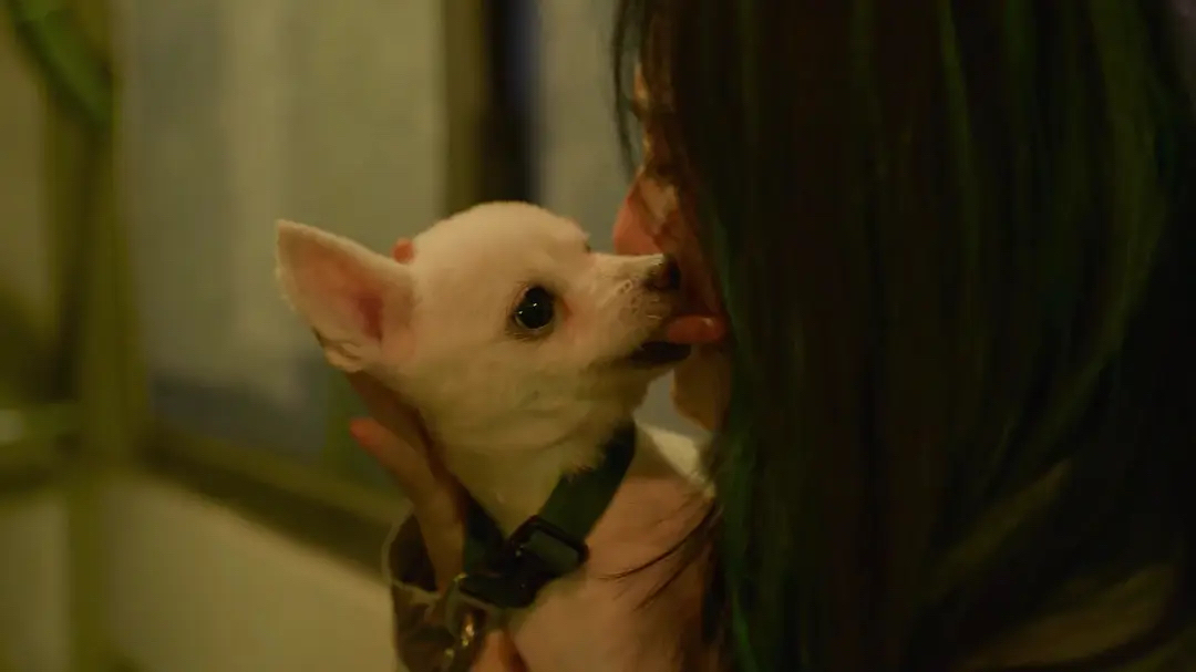 这条线里还有一个很妙的点在于,导演前期有意识地把绿发女生塑造成一个表面“黏人小狗”的角色,使前中期很多剧情看起来都像一个标准的《姐狗爱情故事》(笑),最后甚至用小狗当作绿发女子的一个替身,来回应之前台词中绿发女子说过的那句:“我宁愿当一条狗。” 但这里所谓“姐狗”身份,就像导演不断在剧情中给的暗示 (比如:绿发女子在不同情景下,多次抬手像安抚小狗一样,揉金夏头发的镜头)一样,其实是错位的。表面上是金夏在照顾她,在安抚她,而仔细查看剧情就会发现,金夏虽然看似一路都在主导和善后,但她实际上犹豫、摇摆、瞻前顾后且自我规训。真正自由,有魄力下定决心,逼着金夏反抗,逼着金夏正视自己的恐惧的人,从来都是绿发女子。虽然金夏驾驶着摩托车一路在首尔飞驰,但真正给这个飞驰方向,或者让这个飞驰发生的人,是在她身后抱着她的绿发女子。
