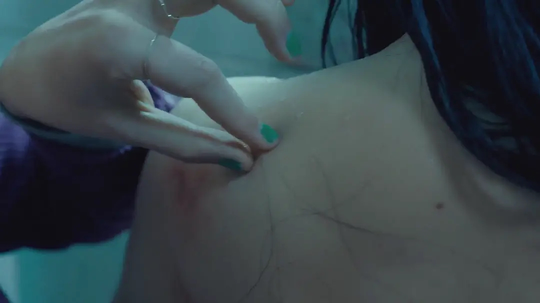 这种关系在之前的浴室的桥段里已经有展现。沐浴后的金夏裹着浴巾,湿漉漉的发梢还在滴水,绿发小姑娘蹲坐在小板凳上望着她。原以为会是情欲流转的一幕,但金夏满身被家暴后的淤青,让一切都变得很沉重。绿发小姑娘慢慢凑近,轻轻摘下她肩头的一根掉落的湿发。