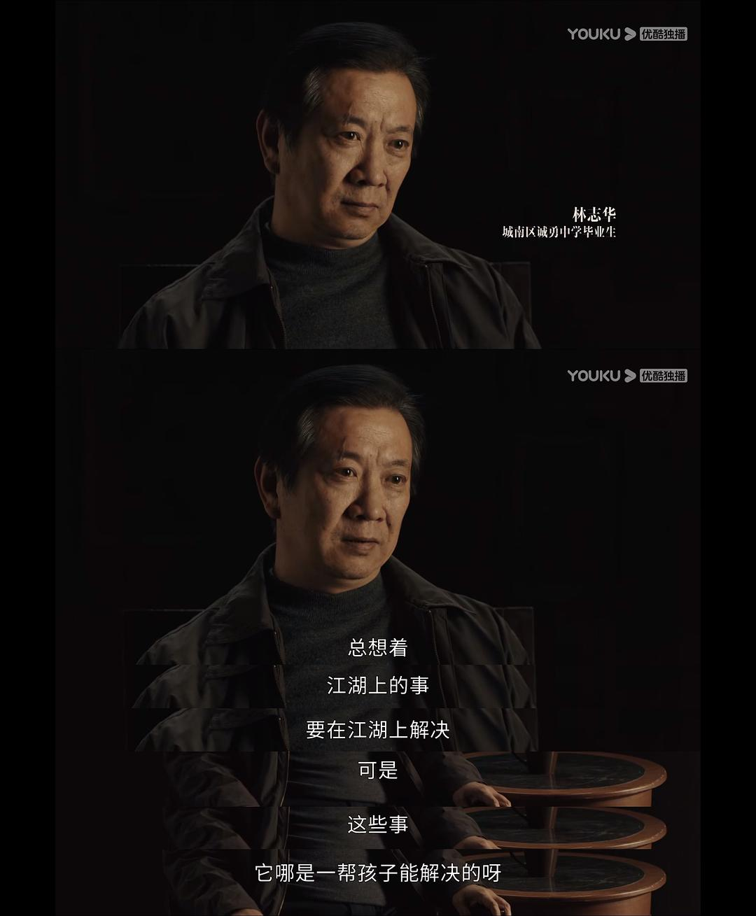 电视剧中浪漫化的情节和后面赤裸的现实形成呼应。比如徐卫彪明知道哥哥在查的案子谁是幕后主凶,他就是不告诉自己的警察哥哥,最后造成自己坐牢,哥哥失业,朋友们四散甚至生死永隔。比如忠余楠全家被灭门,他明明可以报警,却选择自己拿枪复仇,最后失去了唯一亲人姐姐……这些孩子丧失法律意识的原因是什么呢?