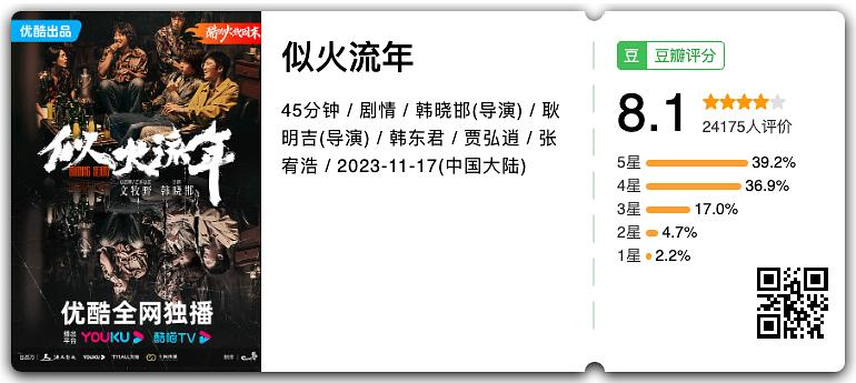 优酷刚播出的《似火流年》是一部很神奇的电视剧,有人说它像《狂飙》,其实除了题材有点类似,但调性完全不同,这类题材肯定是不得善终的悲剧收场,但《狂飙》是制高点跌落,在这之前都是一路上升的,甚至有种小人物翻身的爽剧既视感,但《似火流年》初看是很欢乐闹腾的喜剧调子,但相信我,我追到28集,已经记不得多少次泪流满面,里面每一个人物都各有各的沉重,特别是后面的几集,一路看下来就觉得有种郁结在心头,是那种对命运的无力感,再回看最初夏夜天台上那一帮肆无忌惮的胡同少年,真的是恍如隔世。