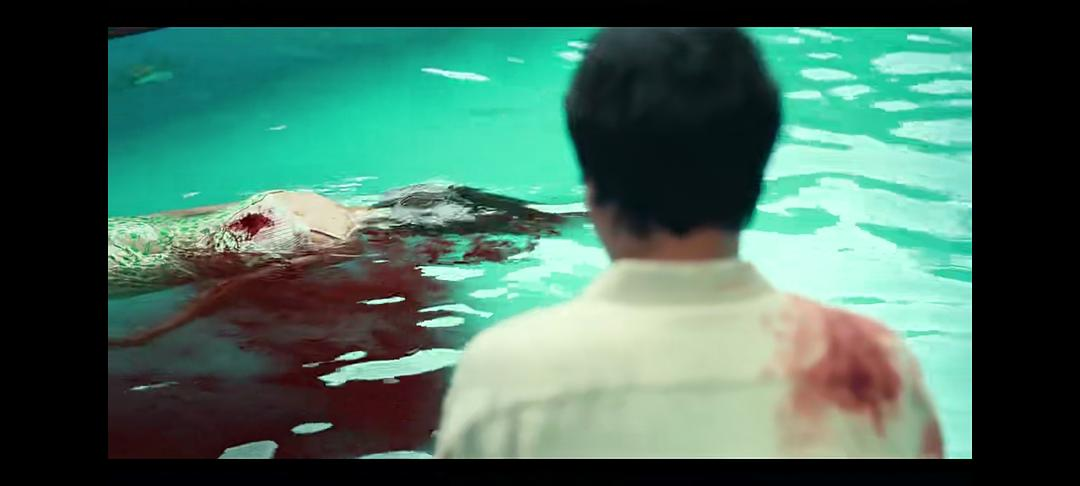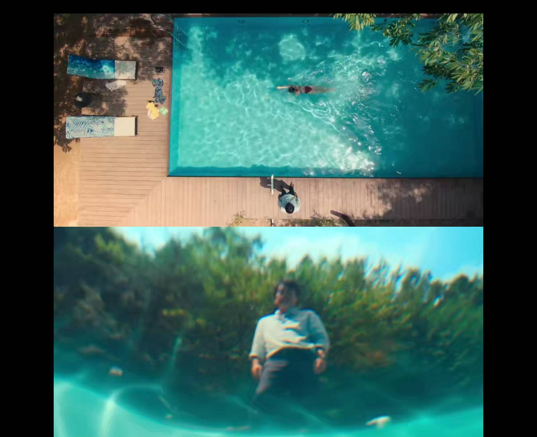 游泳池的画面也很漂亮,漂浮的画、映在水面上的树影,被血染红的蓝,以及一开始说怕水最终死在水中——鸟瞰镜头带来的宿命感。