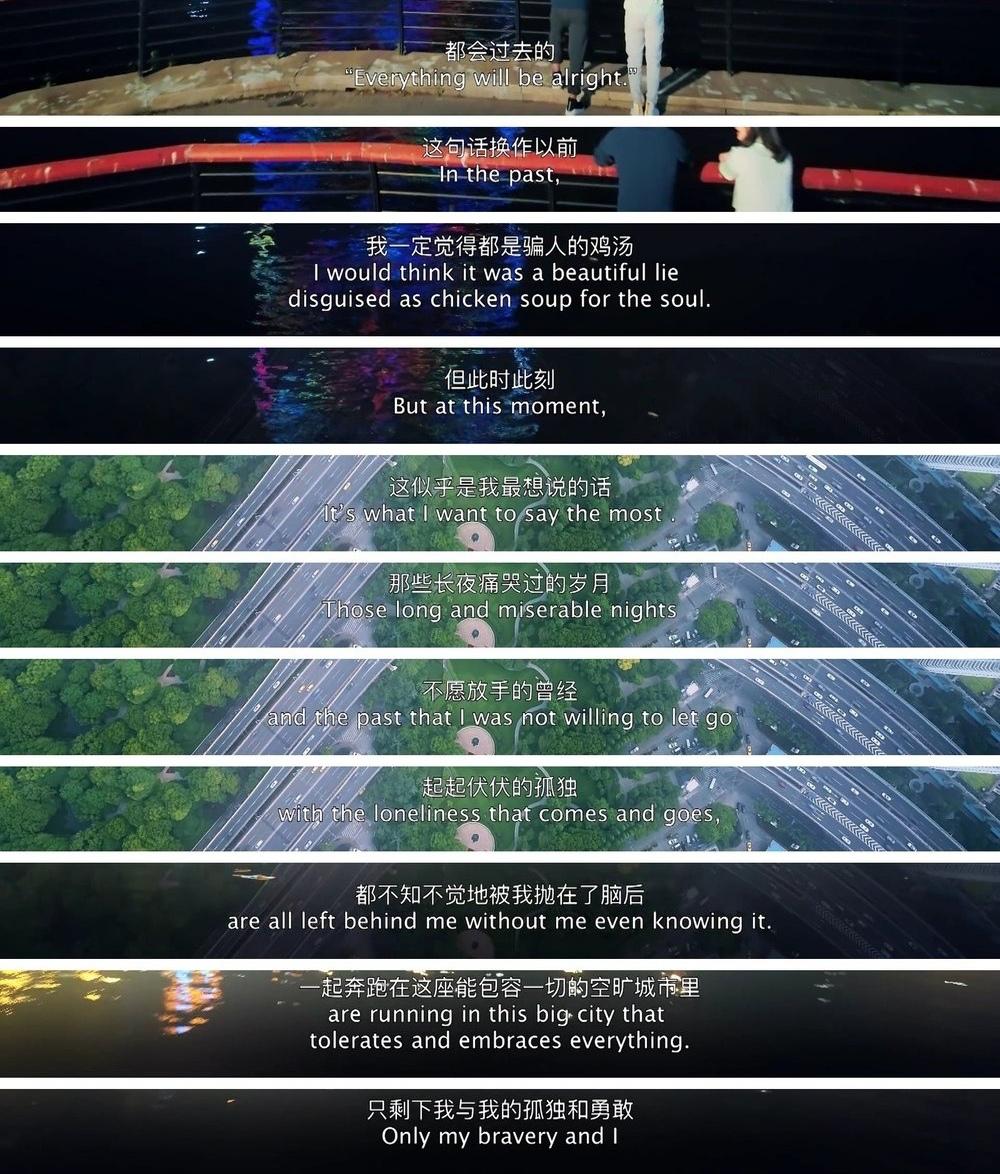 “都会过去的。这句话换做以前,我一定觉得都是骗人的鸡汤。但此时此刻,这似乎是我最想说的话。那些长夜痛哭过的岁月,起起伏伏的孤独,不愿放手的曾经,都不知不觉地被我抛在脑后,只剩下我与我的孤独和勇敢,一起奔跑在这座能包容一切的空旷城市里。”