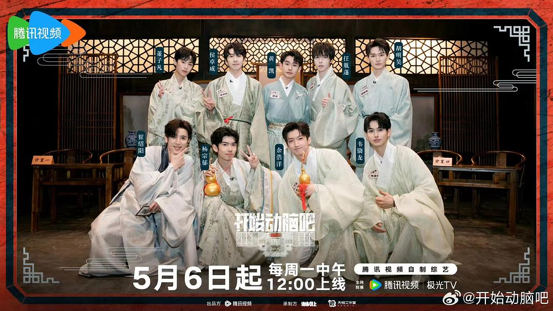 番外《开始动脑吧》,盒子工作室惯用模式,甚至离开芒果后芒果的新节目《魔方新世界》依旧延续这种模式,相当于《明星大侦探》与《名侦探学院》。动脑堂堂主助理:崔绍阳。实习郎中:董子凡、黄凯、胡明昊、侯卓成、任胤蓬、韦骁龙、余浩洋、杨宗郁。崔绍阳演过《宁安如梦》张凌赫的替身。黄凯与胡明昊是OFFER5实习律师。任胤蓬,1999-9-12,是《明日之子乐团季》大提琴手。董子凡,1999-7-31,伦敦大学经济统计,萌扬文化签约演员,演过《在暴雪时分》男四。侯卓成,1999-10-26,北京大学国际关系学院,《心动的信号第六季》嘉宾。韦骁龙,1994年,2013年滨海理科状元,北京大学信息科学技术学院。余浩洋,南京大学哲学系。杨宗郁,02年,清华大学探微书院化学生物学+高分子材料与工程专业学生,《 中国诗词大会》第六季第八场擂主。学历总结,崔绍阳与任胤蓬一般,剩下3个北大,2个清华,一个南京,一个伦敦。