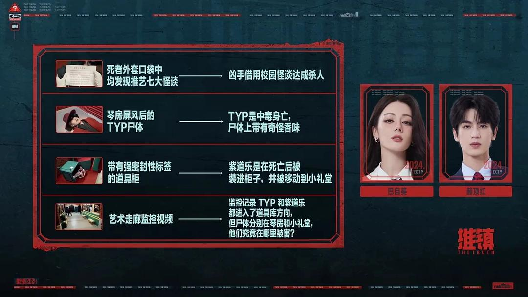 20240530第五期:推艺怪谈之血柜疑云,两星。嘉宾:白宇、迪丽热巴、刘宇宁、张凌赫、周柯宇,飞行嘉宾:金靖。NPC:张紫宁、马雪阳 、孙芮 、崔绍阳、黄凯、侯卓成 、任胤蓬 、Gen1es组合乔一鱼 、王珂、曾雪瑶、欧阳娣娣、朱奕萌。与发布会同天为录制,此时金靖已怀孕,别问我她啥时候结婚的,有几个明星公布已婚的,除非被曝光。我上个节目在王牌看她撩宋亚轩,转过来这个节目公布怀孕已经恋爱结婚很多年了,同时还录制了《萌探2024》。明显其他人都知道她怀孕了,关灯换恐怖场景的时候,平常吓得要死的迪丽热巴与刘宇宁都会去扶金靖。小盒子这是逮着天树就不放了,抄完金田一抄侦探学园q,明侦抄完开推抄,芒果抄完腾讯抄,这不就是金田一不动高中七大不可思议事件吗!你也就是隔条海,否则法院传票都几百份了吧。集中推理环节任何证据都没有就开始乱咬人了,第二位凶手一点思路都没有就开始投票了?两位凶手合作,第一位凶手周柯宇全员推理正确,第二位凶手刘宇宁全员推理错误,数正方形选X两位凶手均未答对不能选择,两位凶手逃脱成功每人一枚金钥匙。