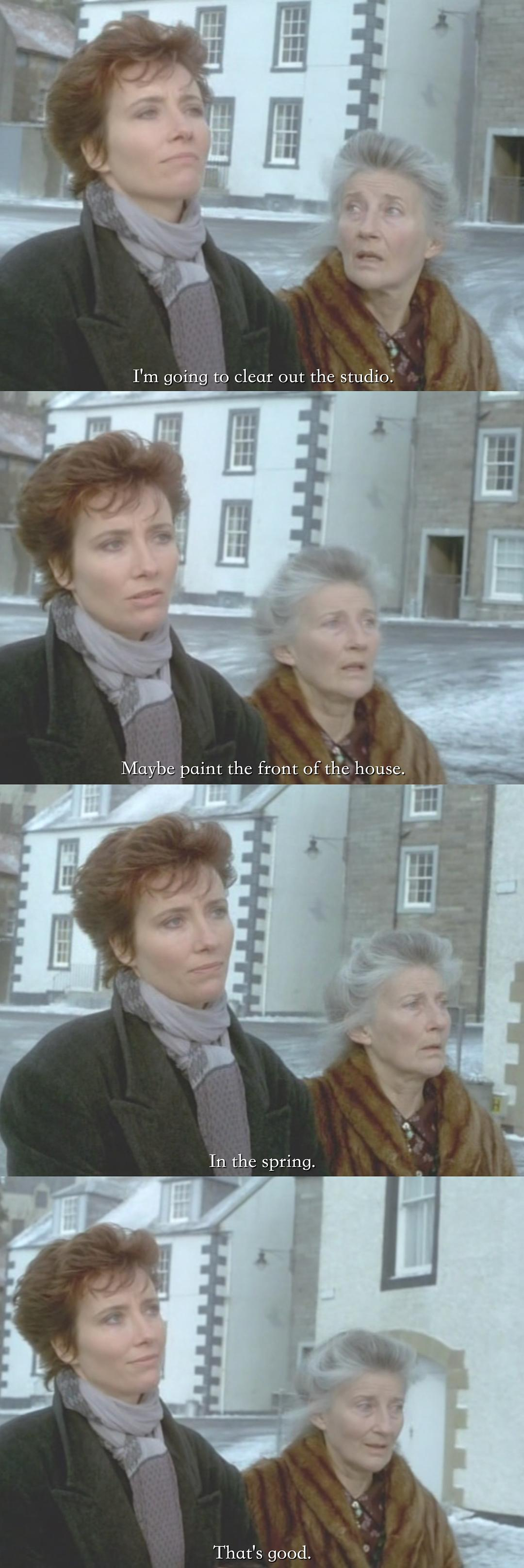 我是先爱上《Take me with you》这首歌,再知道《冬天的访客》的。这中间竟然已隔20年。人生中的时间并不是我最挚爱的,时间的跨度却足以容纳足够多的爱,那种夹杂着缅怀、悔恨和牺牲的东西。影片中艾玛-汤普森母女的行动深深地吸引我们,曾经熟稔的母亲变作一位冬天的访客,只是为了自己即将临近的死亡能有女儿的目送。这本是一个凄怆的故事,但却因为一个更大的主题而使人感到温暖——和好。西方的人伦其实是围绕着神伦展开的,而“和好”是其伦理中的关键。一切的纠葛都必须得到诉说,拆解,以致和好。这跟我们所惯常的视而不见、避而不谈、息事宁人的消解是多么不同。影片中其余的关系,比如儿子和邻家女孩的际遇;年老姊妹俩共赴葬礼,并且全程谈及自己的葬礼,看似谈笑风生,却也潜藏着恐惧;男孩们的海边探险等,都是严寒的苏格兰小镇冬日里的诗意段落,那么温柔,使人心碎,像悠长的海岸线,像悠扬的海风吹着巉岩的低音低徊……