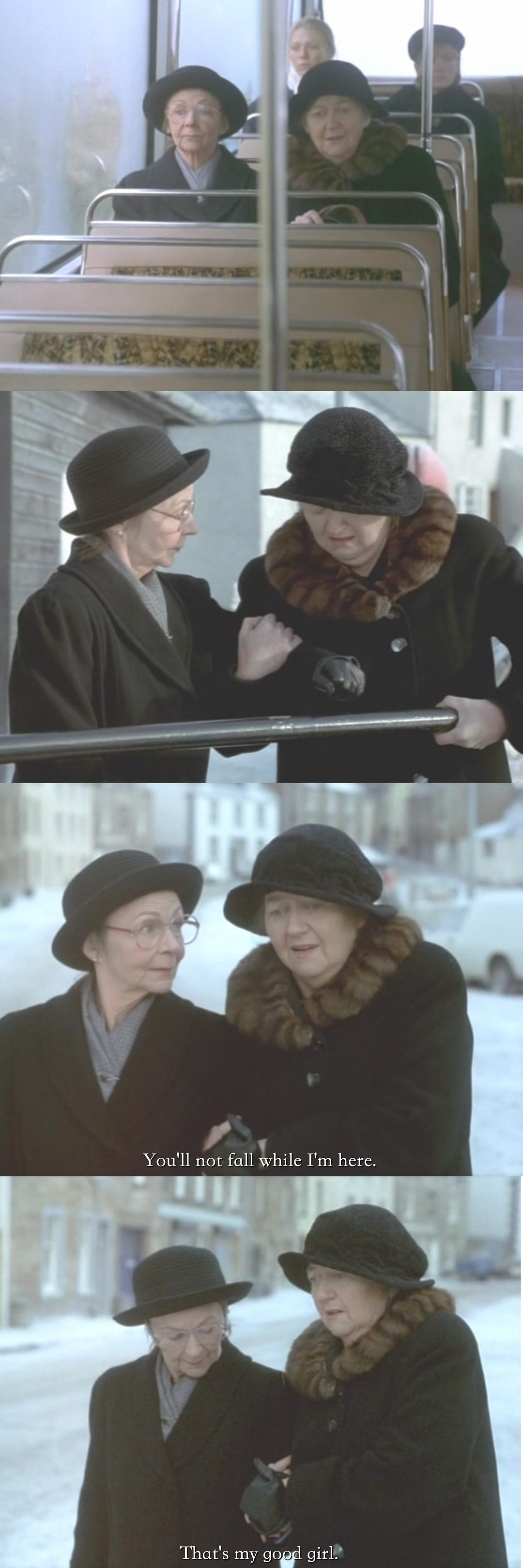 两个无所事事的老太太,一直拌嘴,本来无聊的一天因为一场葬礼有了波折。她们一起分享蛋糕,坐很远路程的公交车,选择靠窗的位置。在其中一位被死亡吓坏了的时候另一个会伸出手说“你抓着我的胳膊,我保证你不会摔倒。”