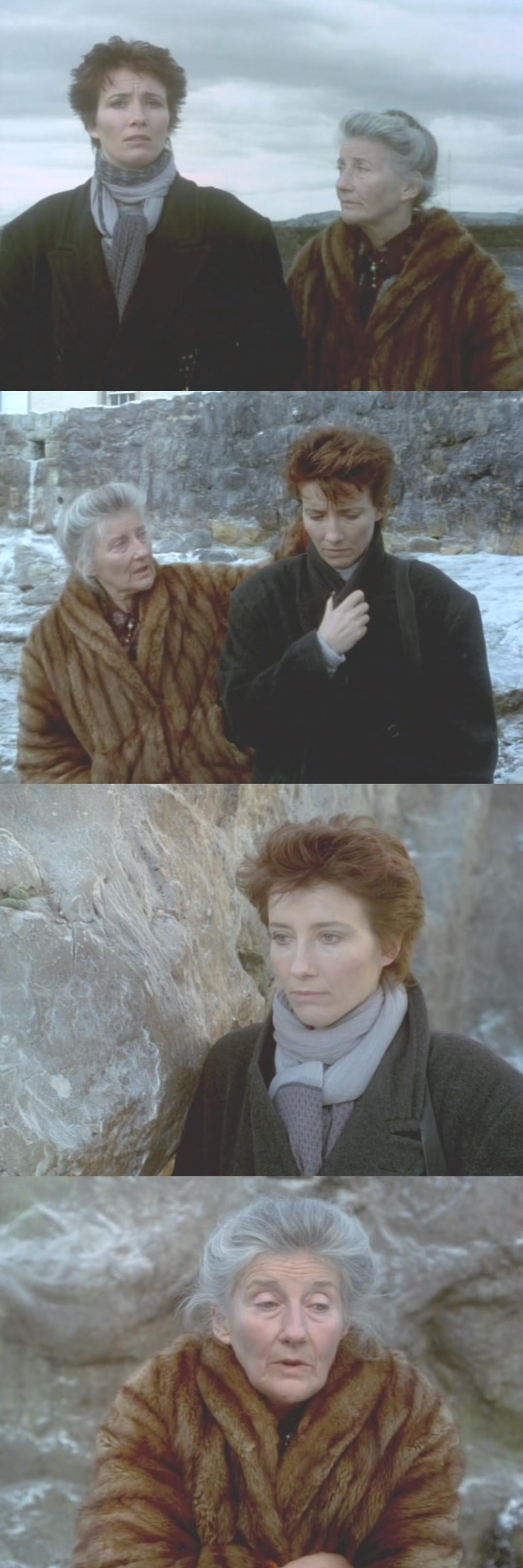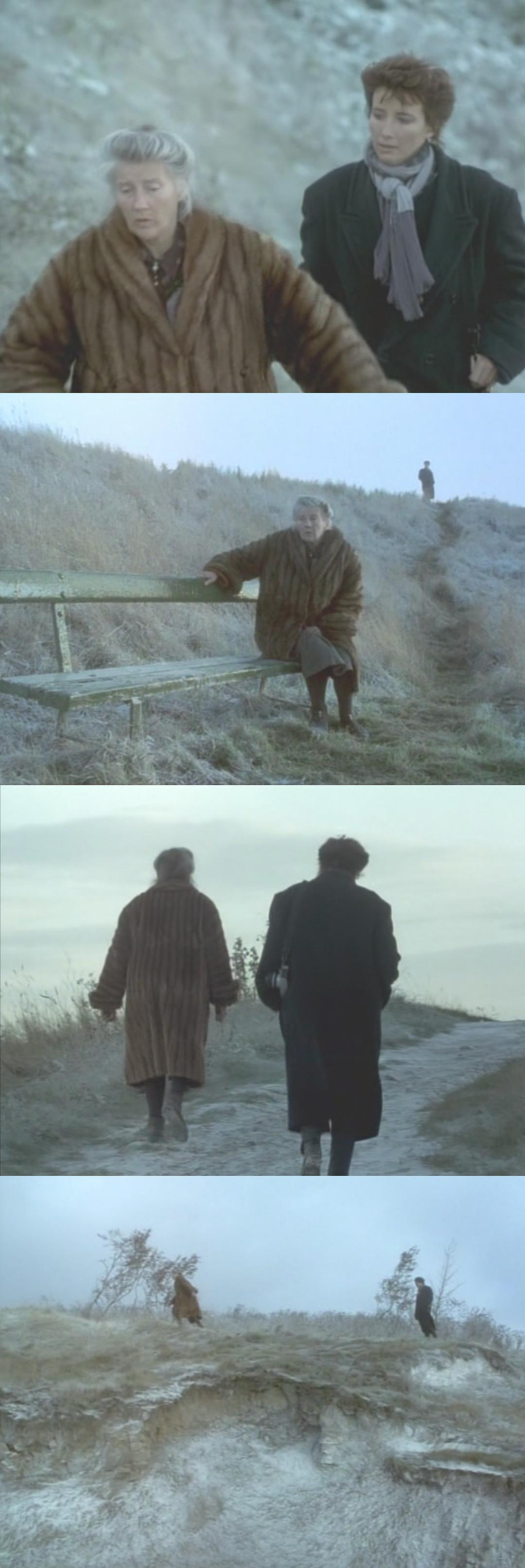 此片当属后者,纯净的天空,洁白的大雪,冰冷的海风,刺骨的忧伤,四个不同年龄的人物在这个寒冷的冬日,各怀心事。母亲急于拯救自己新寡的女儿,新寡无法走出孤独的失落,儿子初尝恋爱的懵懂,与邻居家姑娘准备偷食禁果。。。。再外加两过场戏的顽童和去赶葬礼的老太。