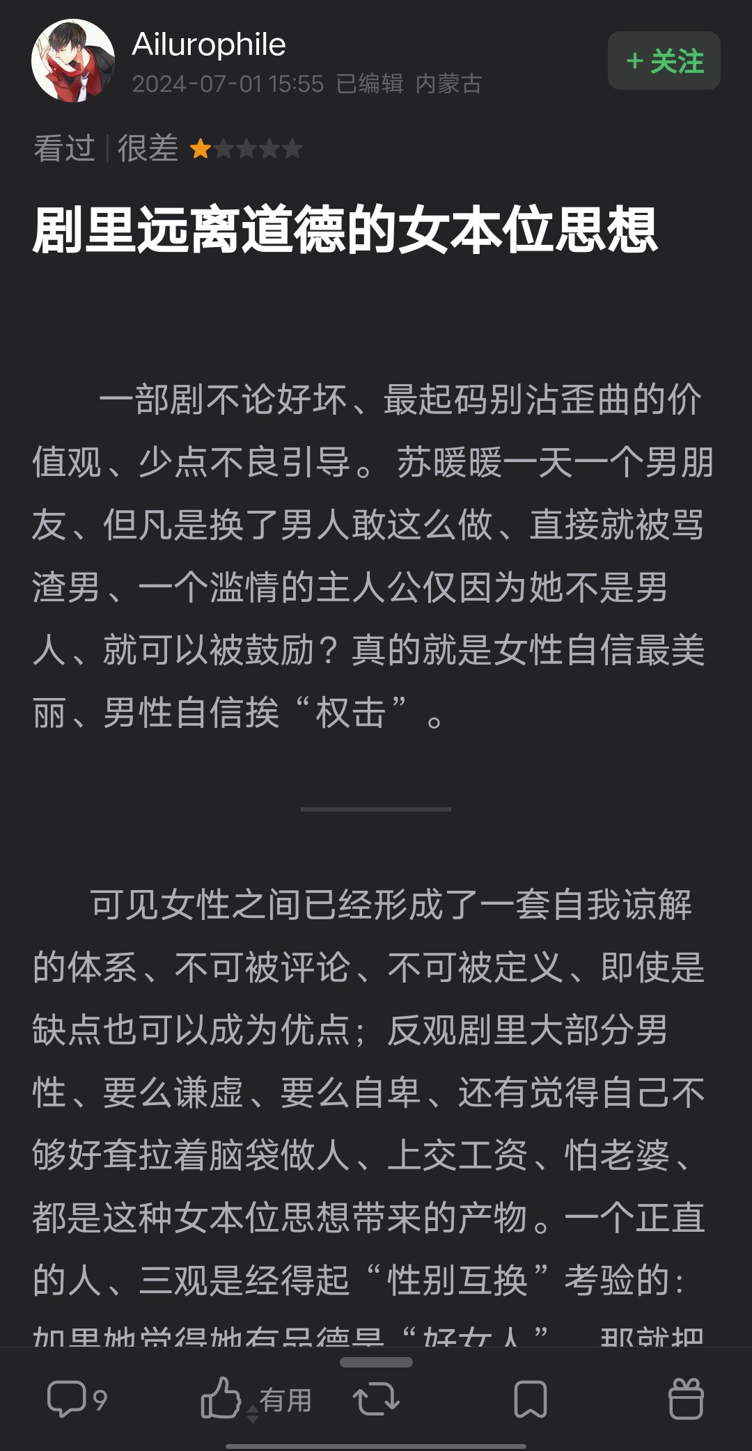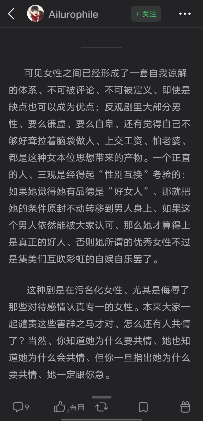 可见女性之间已经形成了一套自我谅解的体系、不可被评论、不可被定义、即使是缺点也可以成为优点;反观剧里大部分男性、要么谦虚、要么自卑、还有觉得自己不够好耷拉着脑袋做人、上交工资、怕老婆、都是这种女本位思想带来的产物。一个正直的人、三观是经得起“性别互换”考验的:如果她觉得她有品德是“好女人”、那就把她的条件原封不动转移到男人身上、如果这个男人依然能被大家认可、那么她才算得上是真正的好人、否则她所谓的优秀女性不过是集美们互吹彩虹的自娱自乐罢了。